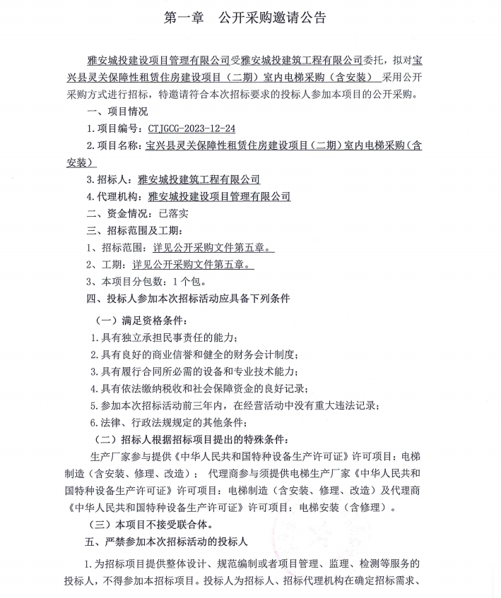 寶興縣靈關(guān)保障性租賃住房建設(shè)項(xiàng)目(二期)室內(nèi)電梯采購(gòu)(含安裝)公開(kāi)采購(gòu)邀請(qǐng)公告