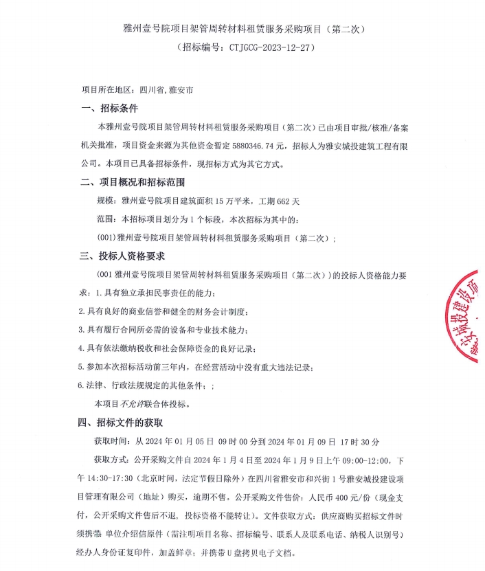 雅州壹號院項目架管周轉(zhuǎn)材料租賃服務(wù)采購項目(第二次)公告