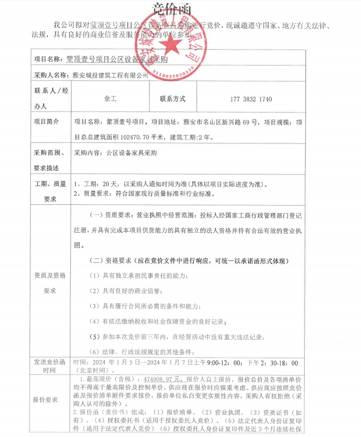 蒙頂壹號(hào)項(xiàng)目公區(qū)設(shè)備家具采購競價(jià)公告