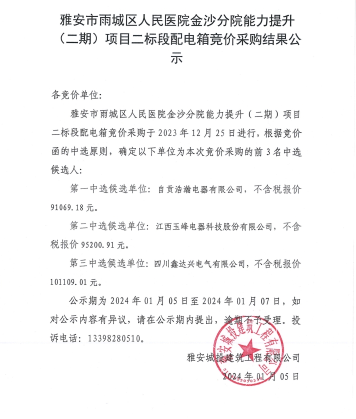 雅安市雨城區(qū)人民醫(yī)院金沙分院能力提升(二期)項(xiàng)目二標(biāo)段配電箱競(jìng)價(jià)采購(gòu)結(jié)果公示