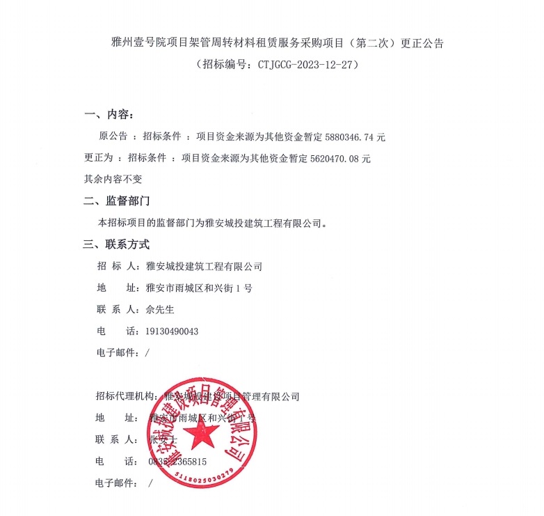 雅州壹號院項目架管周轉材料租賃服務采購項目(第二次)更正公告