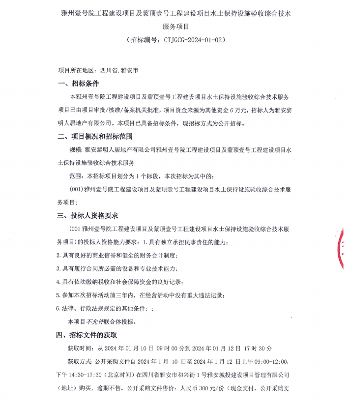雅州壹號(hào)院工程建設(shè)項(xiàng)目及蒙頂壹號(hào)工程建設(shè)項(xiàng)目水土保持設(shè)施驗(yàn)收綜合技術(shù)服務(wù)項(xiàng)目公告