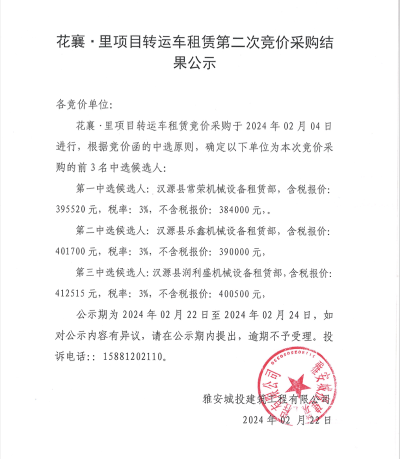花襄·里項(xiàng)目轉(zhuǎn)運(yùn)車租賃第二次競價(jià)采購結(jié)果公示