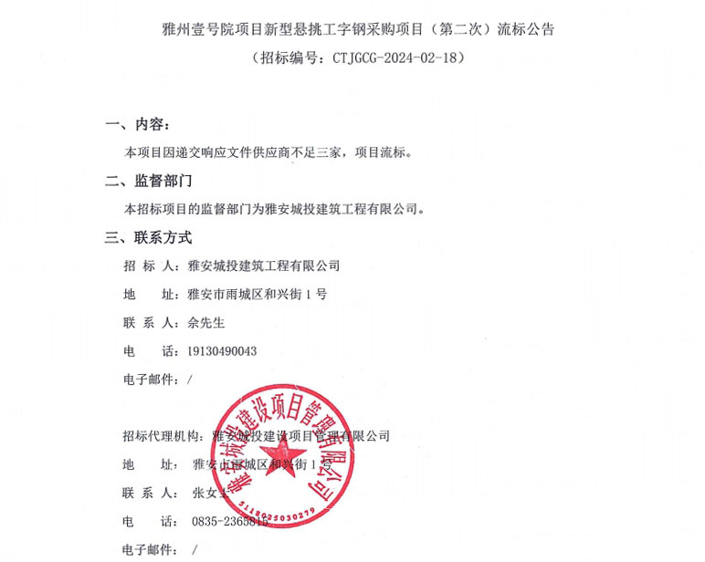 雅州壹號(hào)院項(xiàng)目新型懸挑工字鋼采購項(xiàng)目(第二次)流標(biāo)公告