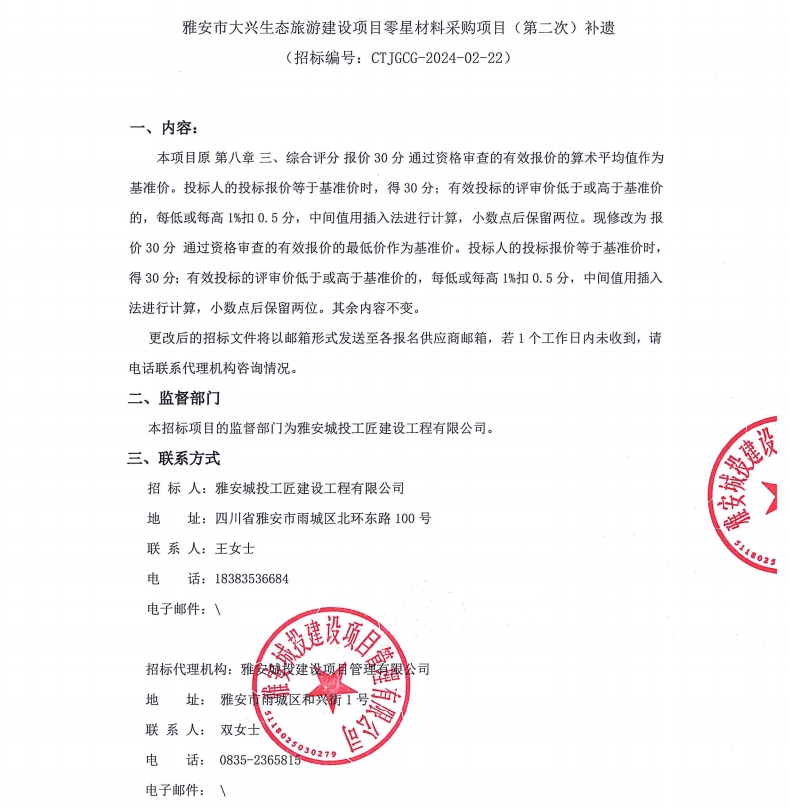 雅安市大興生態(tài)旅游建設(shè)項(xiàng)目零星材料采購(gòu)項(xiàng)目(第二次)補(bǔ)遺公告