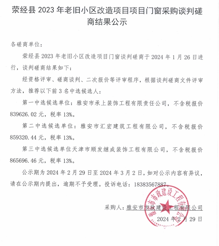 滎經(jīng)縣2023年老舊小區(qū)改造項目門窗采購采購談判磋商結(jié)果公示