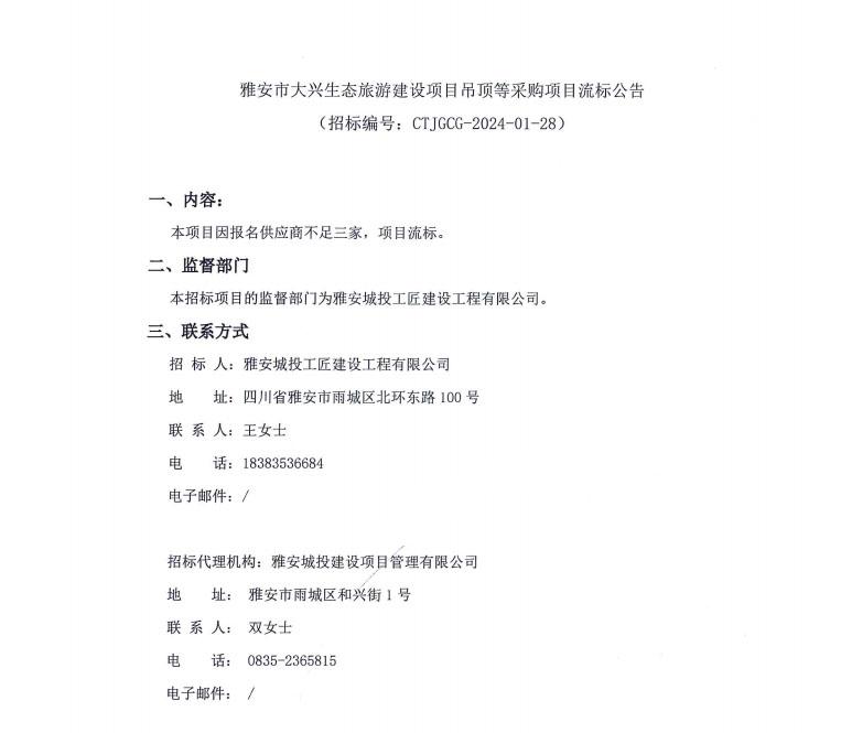 雅安市大興生態(tài)旅游建設(shè)項(xiàng)目吊頂?shù)炔少忢?xiàng)目流標(biāo)公告