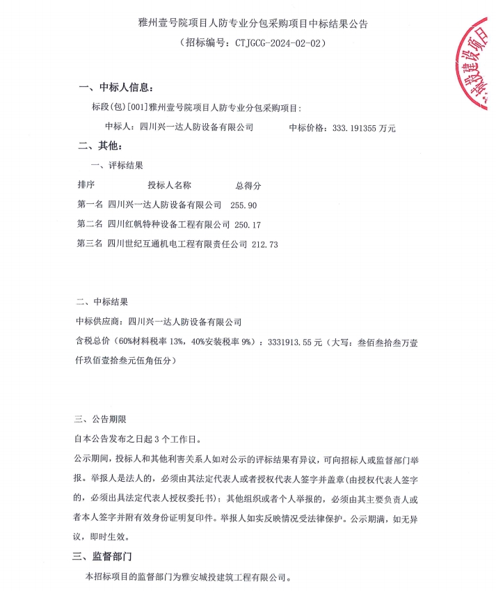 雅州壹號院項目人防專業(yè)分包采購項目中標(biāo)結(jié)果公告