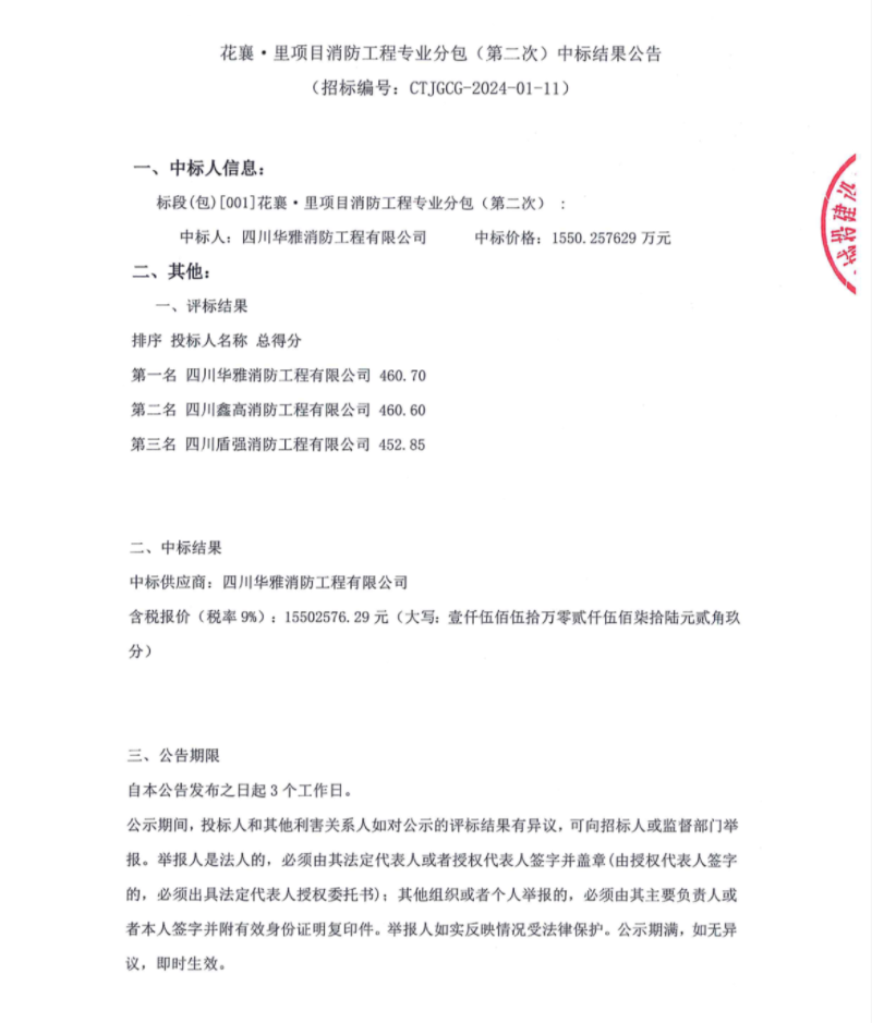 花襄·里項(xiàng)目消防工程專業(yè)分包(第二次)中標(biāo)結(jié)果公告
