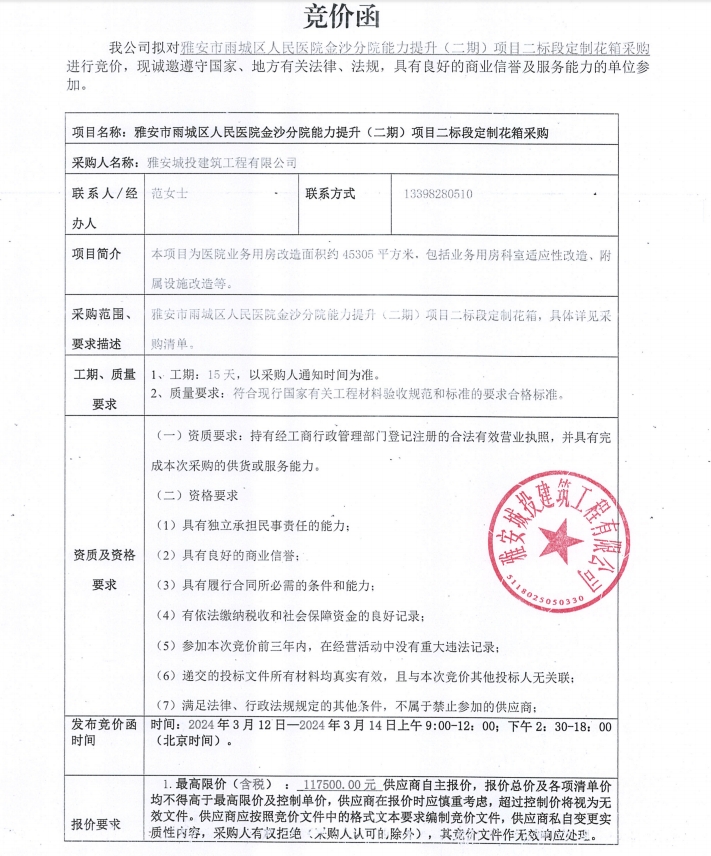 雅安市雨城區(qū)人民醫(yī)院金沙分院能力提升(二期)項目二標(biāo)段定制花箱采購競價公告