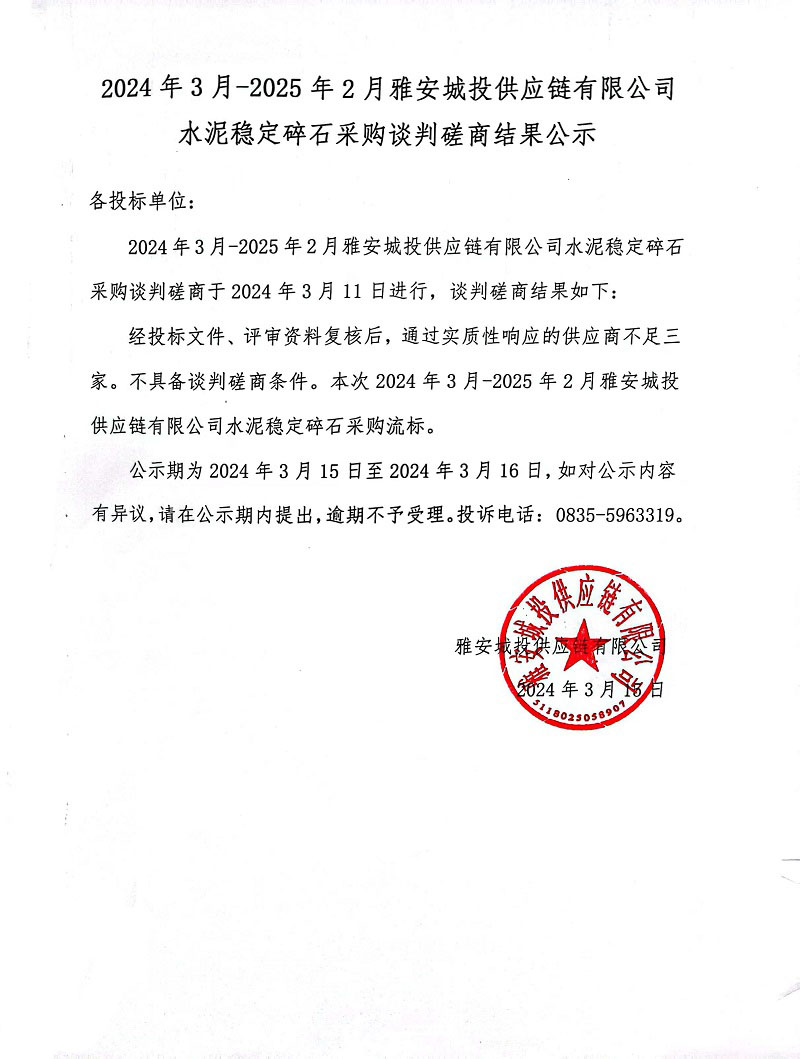 2024年3月-2025年2月雅安城投供應(yīng)鏈有限公司水泥穩(wěn)定碎石采購(gòu)談判磋商結(jié)果公示