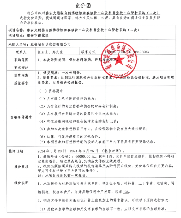 雅安大熊貓自然博物館游客接待中心及科普宣教中心管材采購(二次)競(jìng)價(jià)公告