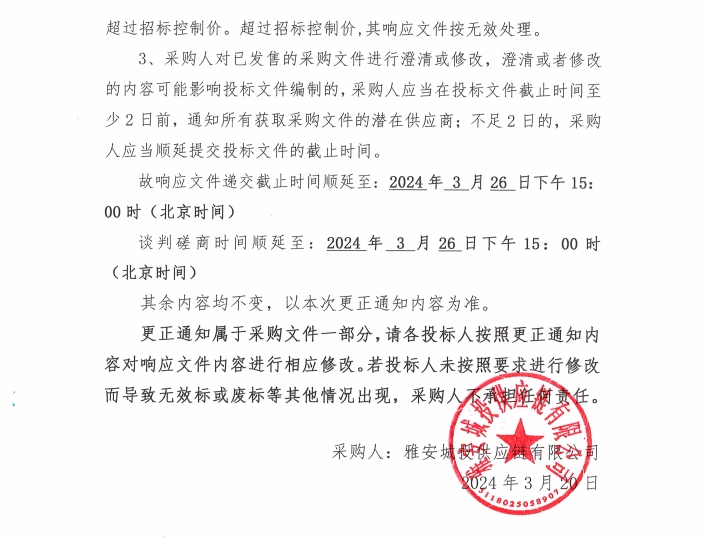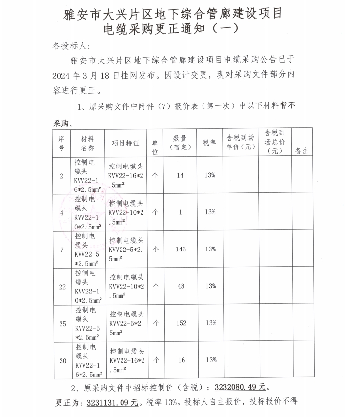 雅安市大興片區(qū)地下綜合管廊建設項目電纜采購更正通知(一)
