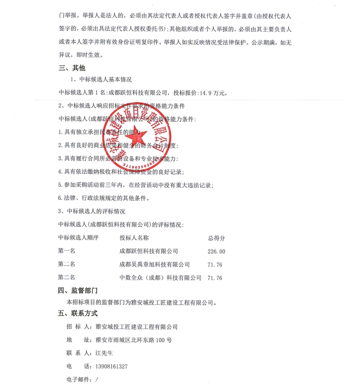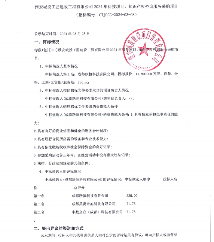 雅安城投工匠建設(shè)工程有限公司2024年科技項(xiàng)目、知識(shí)產(chǎn)權(quán)咨詢服務(wù)采購(gòu)項(xiàng)目公示