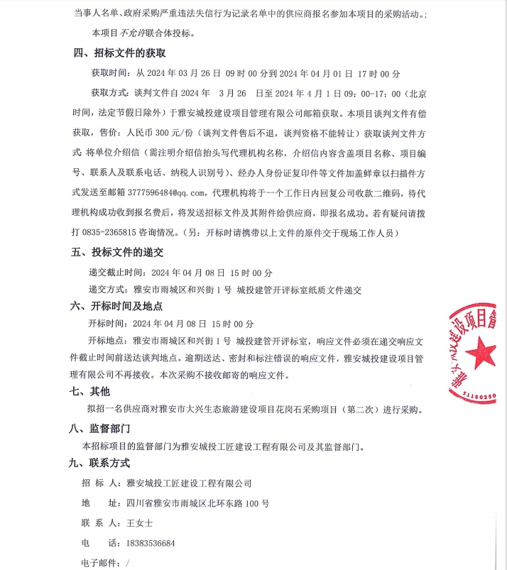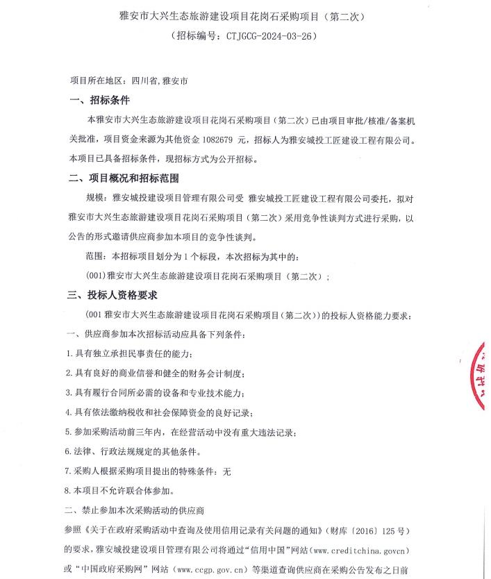 雅安市大興生態(tài)旅游建設項目花崗石采購項目(第二次)公告
