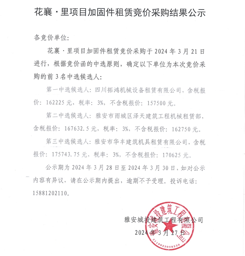 花襄·里項(xiàng)目加固件租賃競(jìng)價(jià)采購(gòu)結(jié)果公示