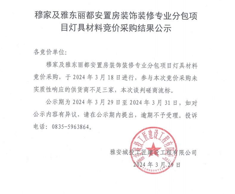 穆家及雅東麗都安置房裝飾裝修專業(yè)分包項目燈具材料采購競價結(jié)果公示