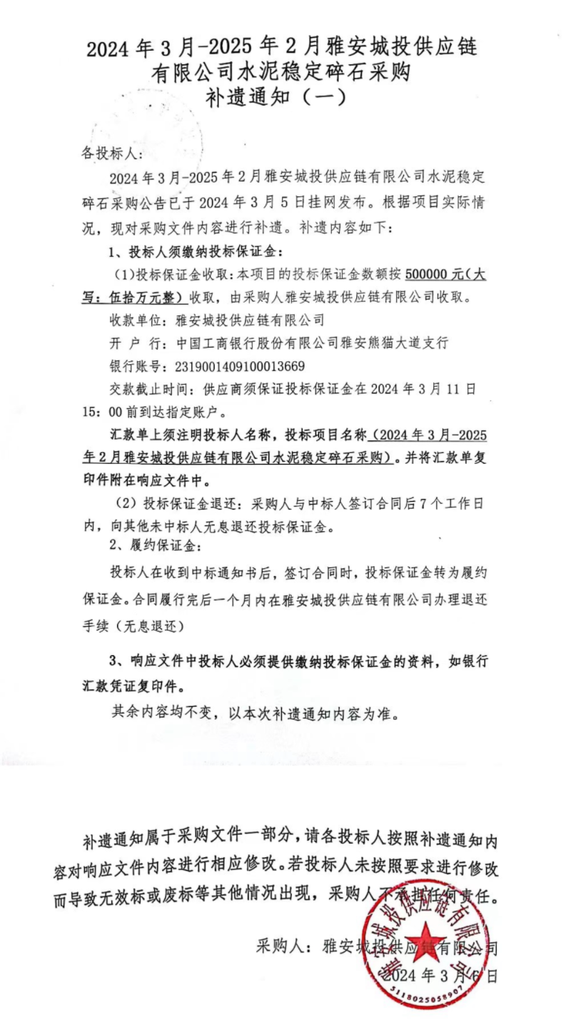 2024年3月-2025年2月雅安城投供應鏈有限公司水泥穩(wěn)定碎石采購補遺通知(一)