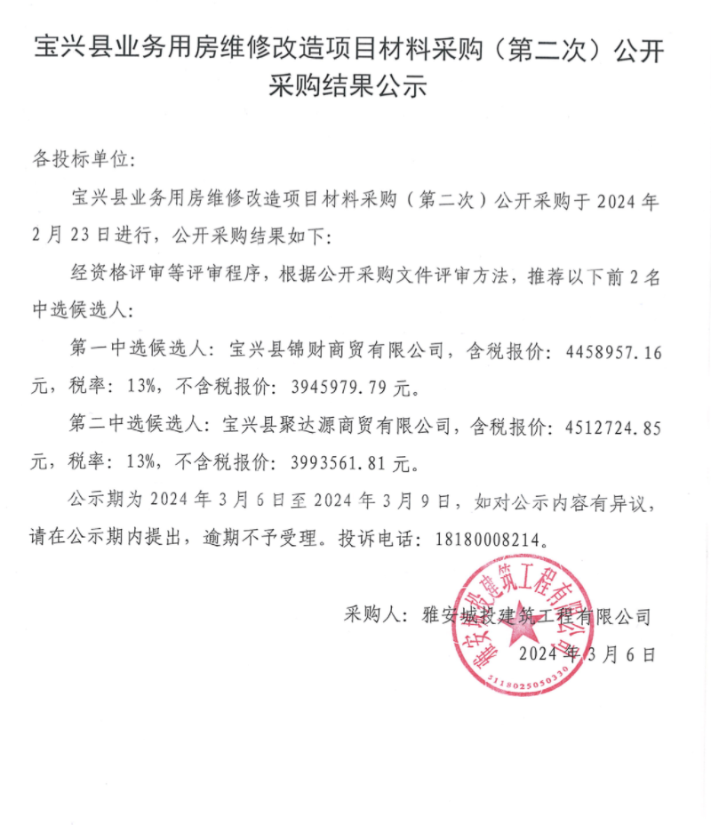 寶興縣業(yè)務(wù)用房維修改造項(xiàng)目材料采購(第二次)公開采購結(jié)果公示