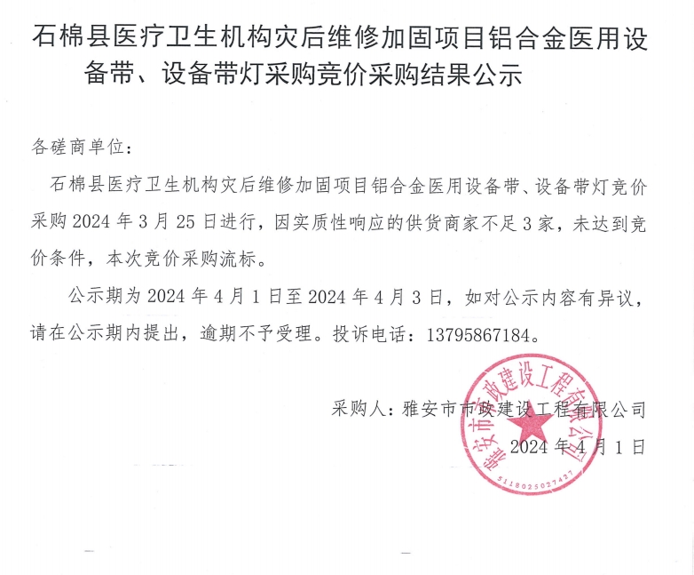 石棉縣醫(yī)療衛(wèi)生機(jī)構(gòu)災(zāi)后維修加固項(xiàng)目鋁合金醫(yī)用設(shè)備帶、設(shè)備帶燈采購競(jìng)價(jià)采購結(jié)果公示