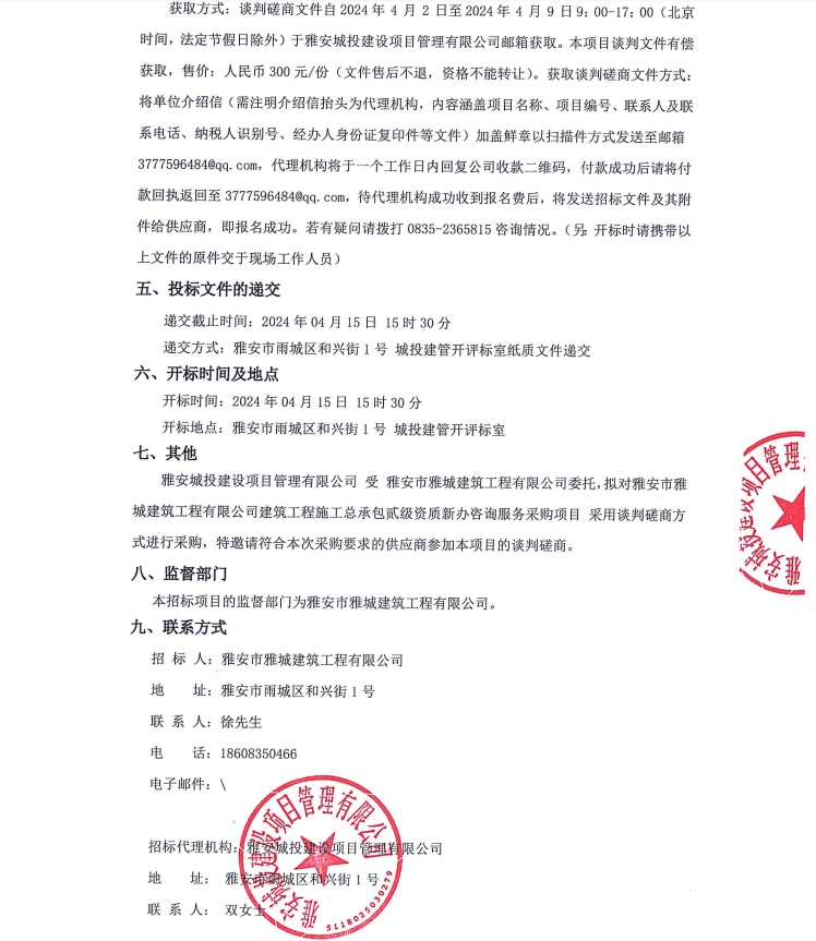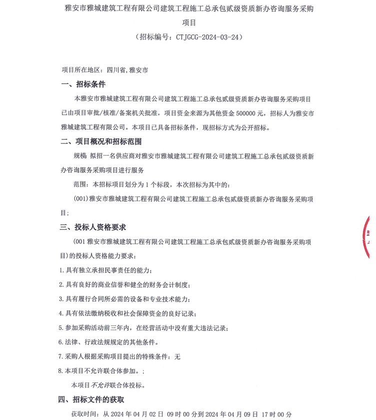 雅安市雅城建筑工程有限公司建筑工程施工總承包貳級(jí)資質(zhì)新辦咨詢服務(wù)采購(gòu)項(xiàng)目公告