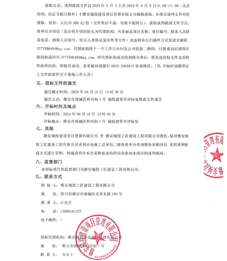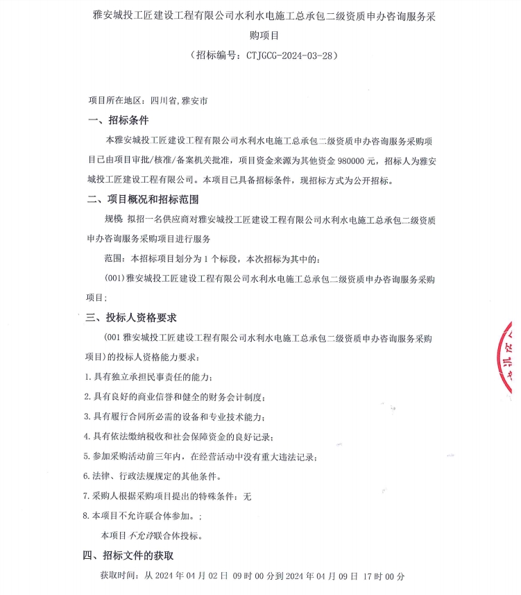 雅安城投工匠建設工程有限公司水利水電施工總承包二級資質申辦咨詢服務采購項目公告