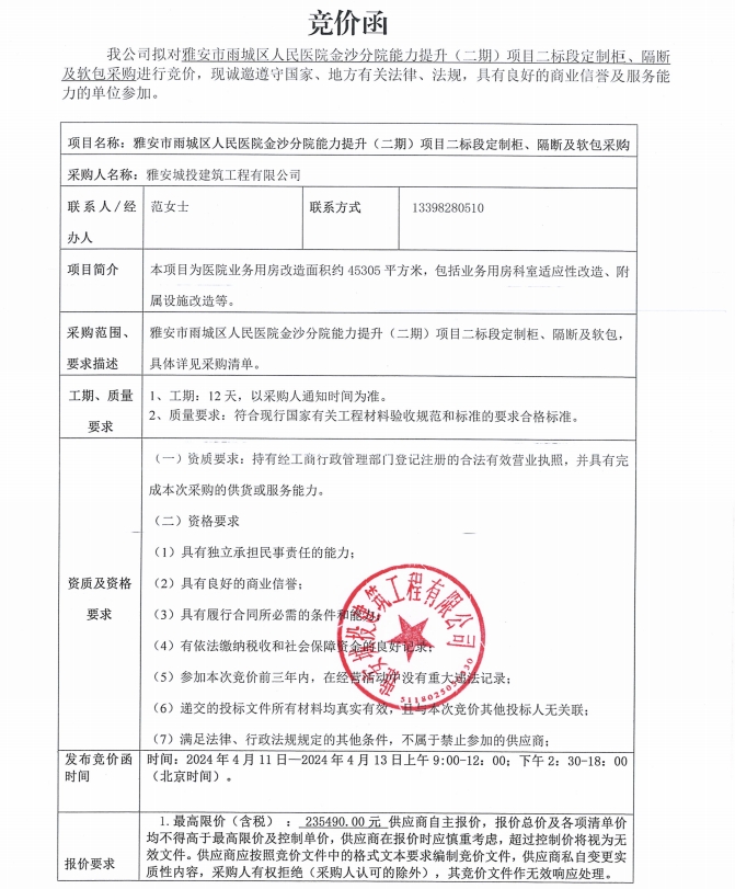 雅安市雨城人民醫(yī)院金沙分院能力提升(二期)項(xiàng)目二標(biāo)段定制柜、隔斷及軟包采購(gòu)競(jìng)價(jià)公告