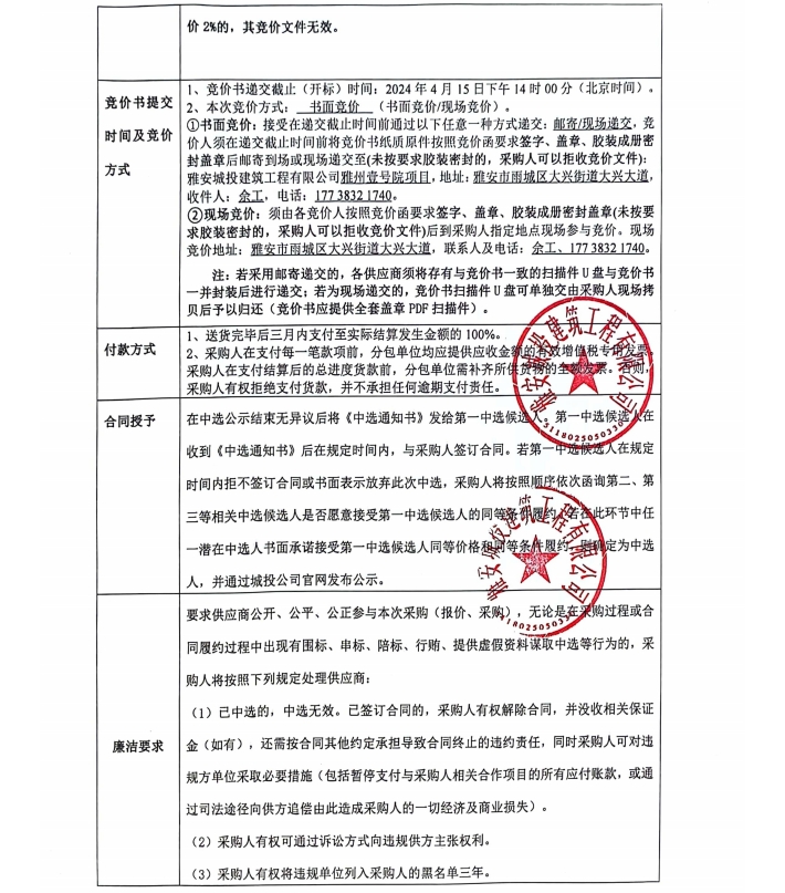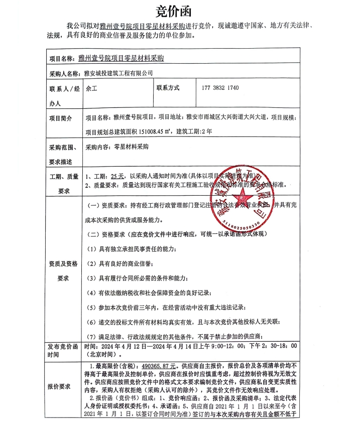 雅州壹號(hào)院項(xiàng)目零星材料采購競價(jià)公告