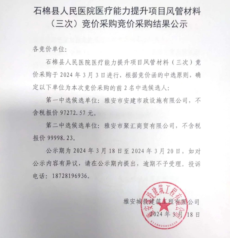 石棉縣人民醫(yī)院醫(yī)療能力提升項(xiàng)目風(fēng)管材料(三次)競價采購競價采購結(jié)果公示