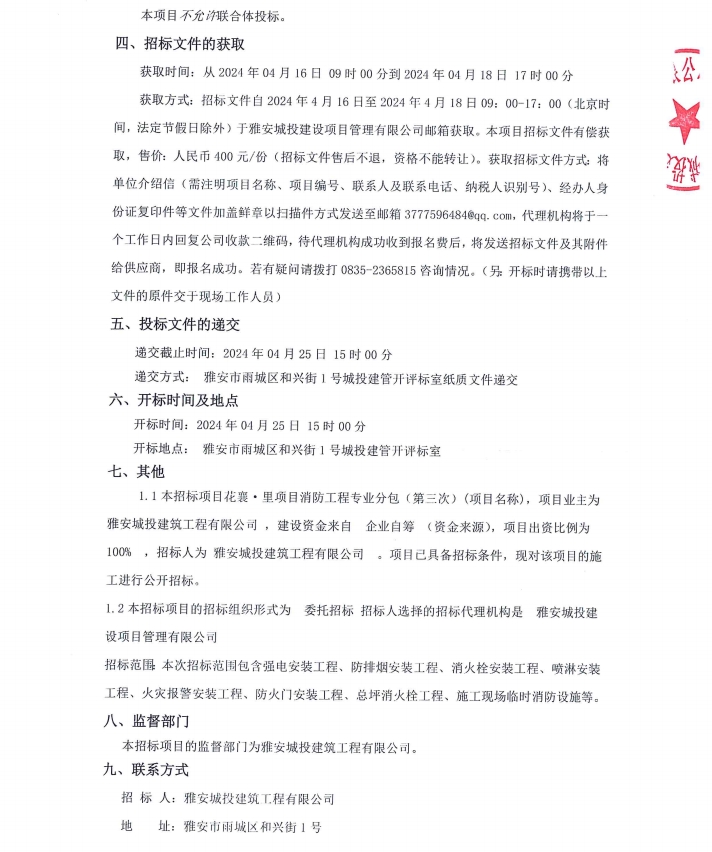 花襄·里項目消防工程專業(yè)分包(第三次)公告