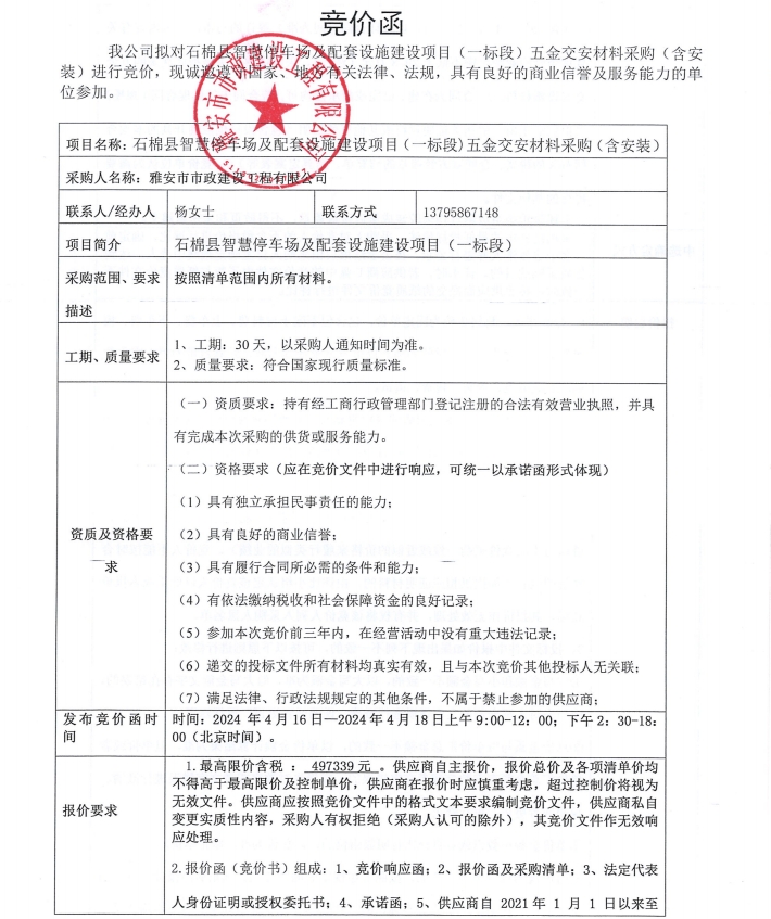 石棉縣智慧停車場及配套設(shè)施建設(shè)項(xiàng)目(一標(biāo)段)五金交安材料(含安裝)競價(jià)公告