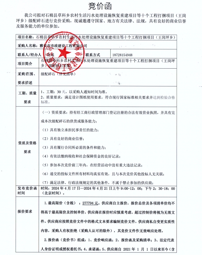 石棉縣草科鄉(xiāng)農村生活污水處理設施恢復重建項目等十個工程打捆項目(王崗坪鄉(xiāng))級配碎石競價公告