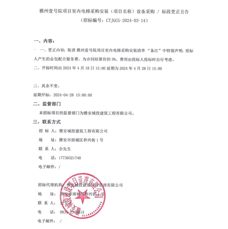 雅州壹號院項目室內(nèi)電梯采購安裝(項目名稱)設(shè)備采購/標段更正公告