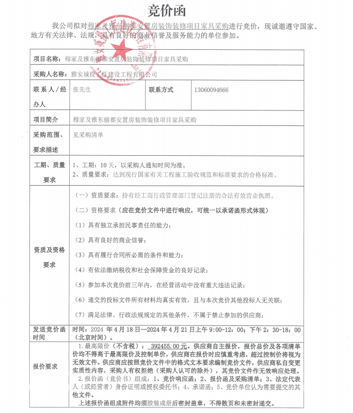穆家及雅東麗都安置房裝飾裝修項(xiàng)目家具采購(第二次)競價(jià)公告