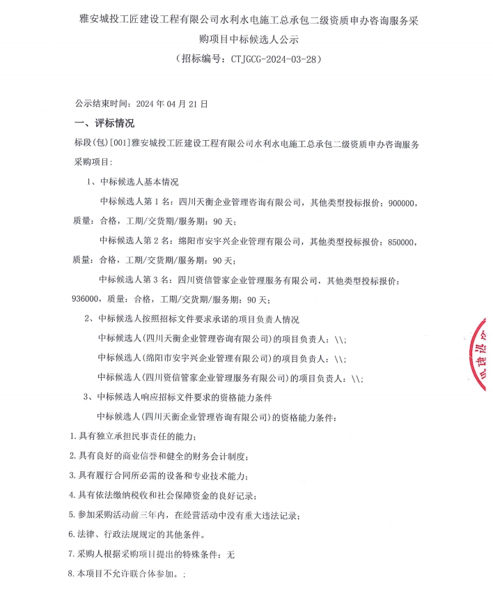 雅安城投工匠建設(shè)工程有限公司水利水電施工總承包二級資質(zhì)申辦咨詢服務(wù)采購項(xiàng)目中標(biāo)候選人公示