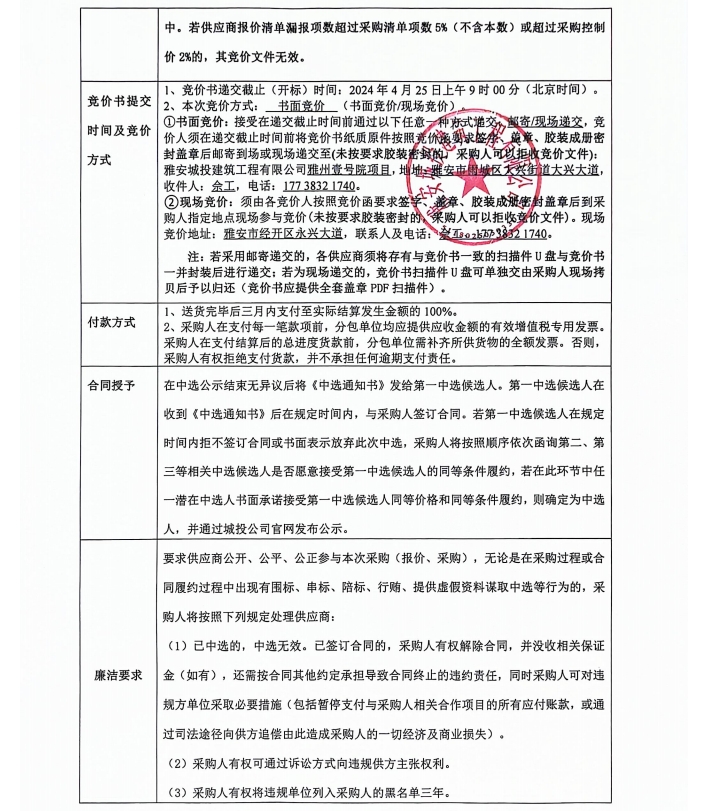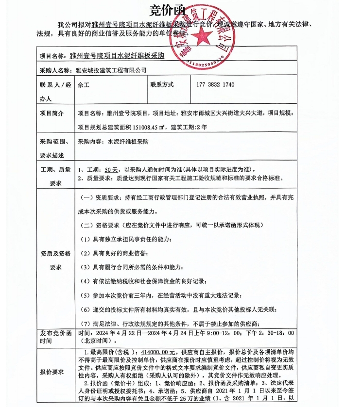 雅州壹號院項目水泥纖維板采購競價公告