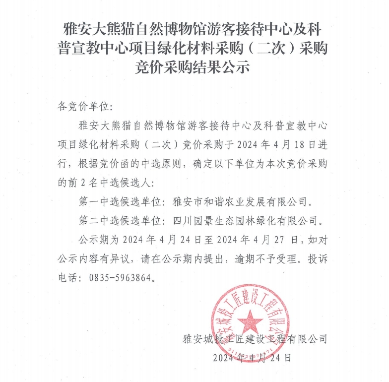 雅安大熊貓自然博物館游客接待中心及科普宣教中心項(xiàng)目綠化材料采購(二次)競(jìng)價(jià)采購結(jié)果公示