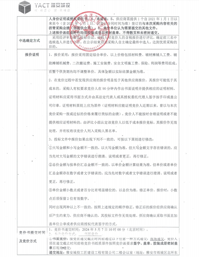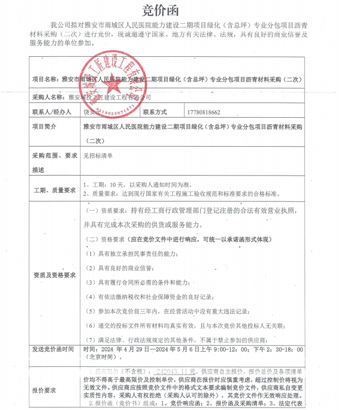 競價函-雅安市雨城區(qū)人民醫(yī)院能力建設(shè)二期項目綠化(含總坪)專業(yè)分包項目瀝青材料采購(二次)
