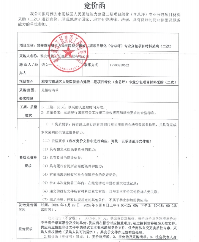 競(jìng)價(jià)函-雅安市雨城區(qū)人民醫(yī)院能力建設(shè)二期項(xiàng)目綠化(含總坪)專業(yè)分包項(xiàng)目材料采購(二次)