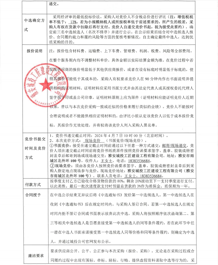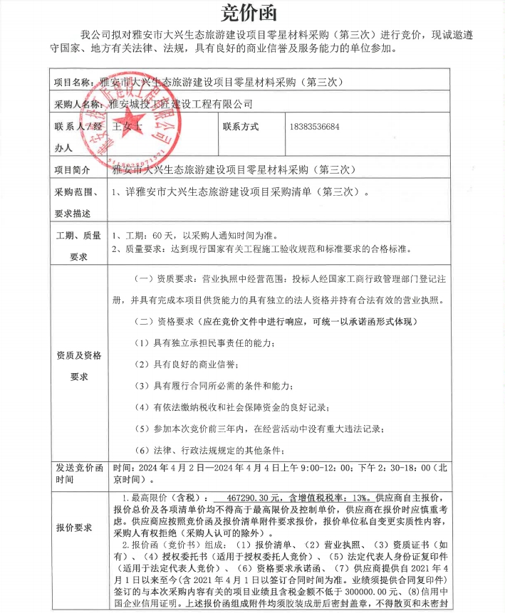 雅安市大興生態(tài)旅游建設(shè)項目零星材料采購(第三次)競價公告