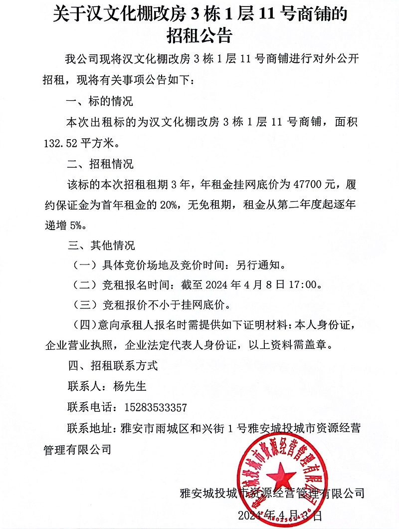 關(guān)于漢文化棚改房3棟1層11號(hào)商鋪的招租公告