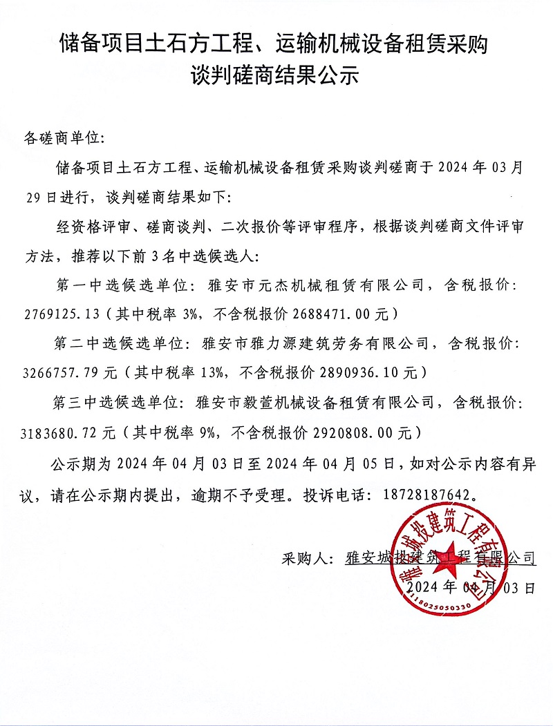 儲(chǔ)備項(xiàng)目土石方工程、運(yùn)輸機(jī)械設(shè)備租賃采購談判磋商結(jié)果公示