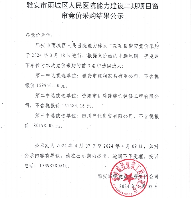 雅安市雨城區(qū)人民醫(yī)院能力建設(shè)二期項(xiàng)目窗簾競價(jià)采購結(jié)果公示