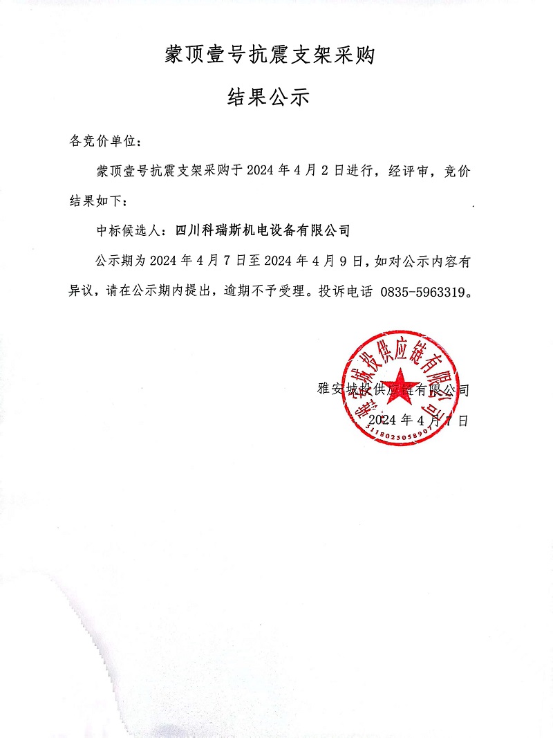蒙頂壹號抗震支架采購結(jié)果公示