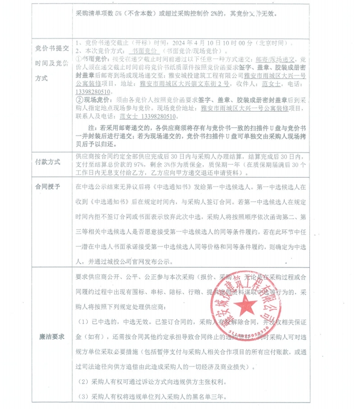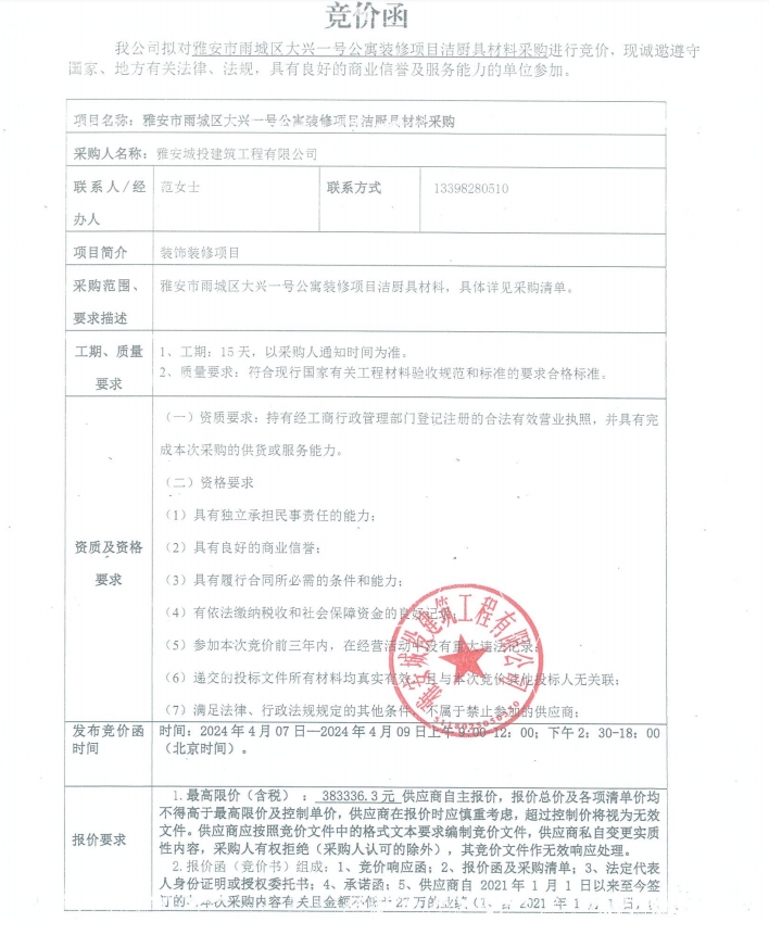 雅安市雨城區(qū)大興一號公寓裝修項(xiàng)目潔廚具材料采購競價(jià)公告