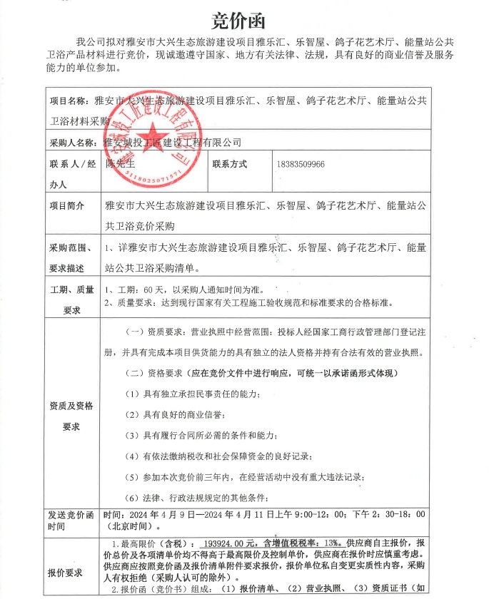 雅安市大興生態(tài)旅游建設(shè)項(xiàng)目雅樂匯、樂智屋、鴿子花藝術(shù)廳、能量站公共衛(wèi)浴材料采購競價(jià)公告