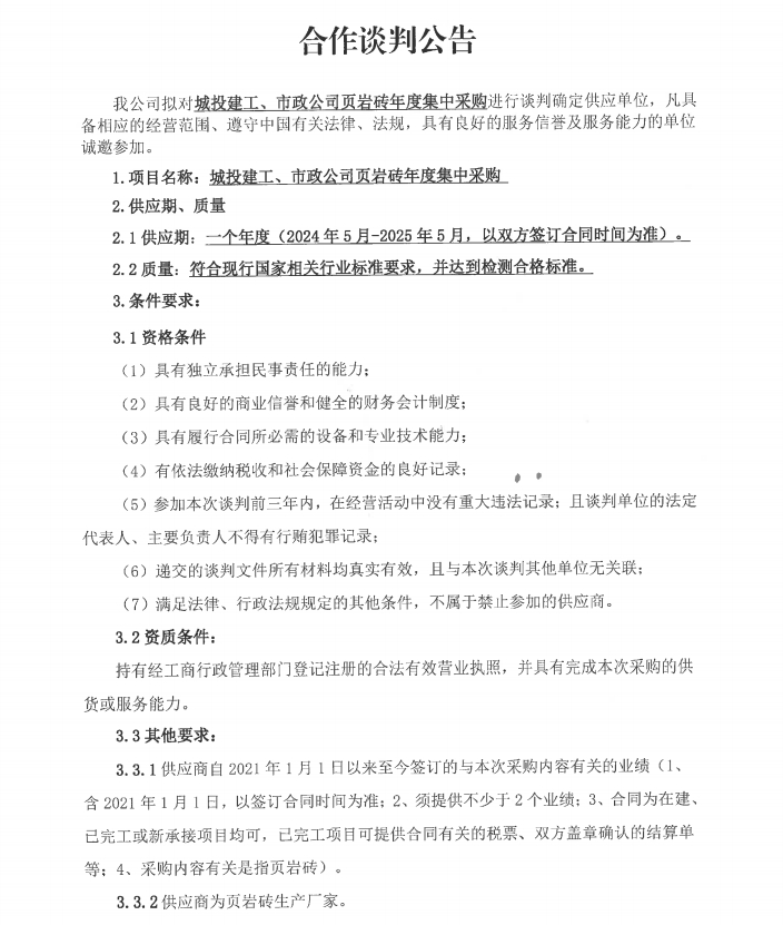城投建工、市政公司頁巖磚年度集中采購合作談判公告