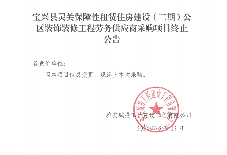 寶興縣靈關(guān)保障性租賃住房建設(shè)(二期)公區(qū)裝飾裝修工程勞務(wù)供應(yīng)商采購項(xiàng)目終止公告