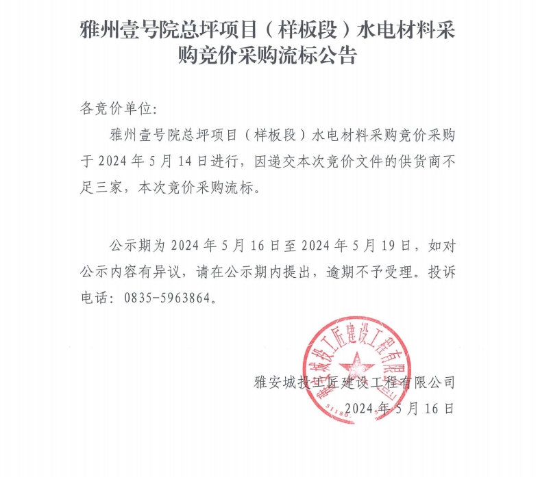 雅州壹號(hào)院總坪項(xiàng)目(樣板段)水電材料采購競價(jià)采購流標(biāo)公告