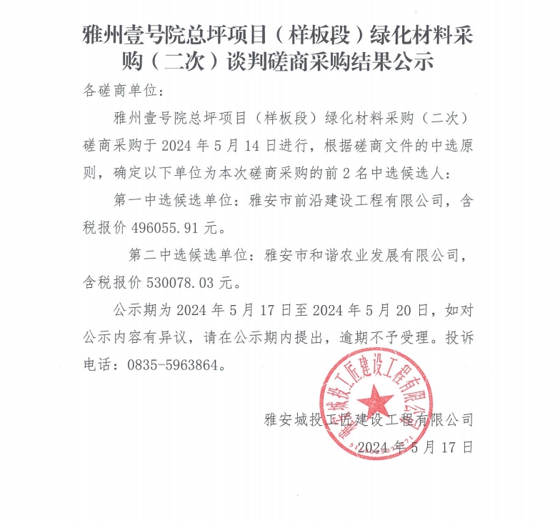 雅州壹號院總坪項目(樣板段)綠化材料采購 (二次)談判磋商采購結果公示